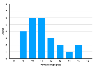 De verdeling van verwantschapsgraden is te zien in de figuur hieronder.